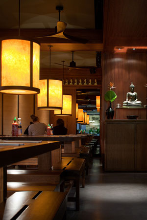 Colour, lighting, texture and any pictorial depiction is important, particularly in international cuisine in creating that all-important intimacy of atmosphere, where the slightest cultural connotation is examined. For example, in our restaurant to complete in 2016 in Lalit London in the former Assembly hall, we have draped canvas of Moghul scenes, where as in Dubai Busaba EatThai depiction is always in floral form, and in our latest Turkish Pizza restaurant for Alan Yau – Babaji - blue geometric tiles are used - as if they had been found in the Blue Mosque in Istanbul.