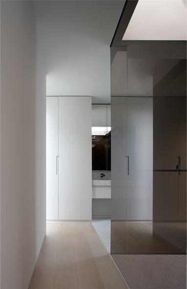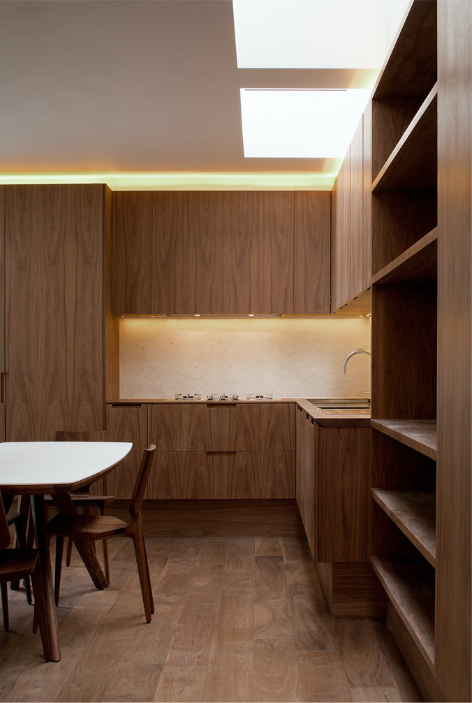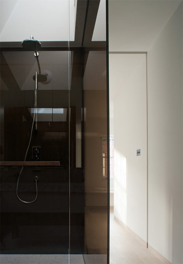 The original kitchen area was revitalised as a study and library and an open-plan kitchen was created at the heart of the house, providing a flexible environment for entertaining. The bathrooms were extended and reconfigured using Thassos marble, mosaics and coloured glass. The master bedroom is on the top floor and includes a bathroom enhanced by smoked glass and skylights to deepen the relaxation experience.