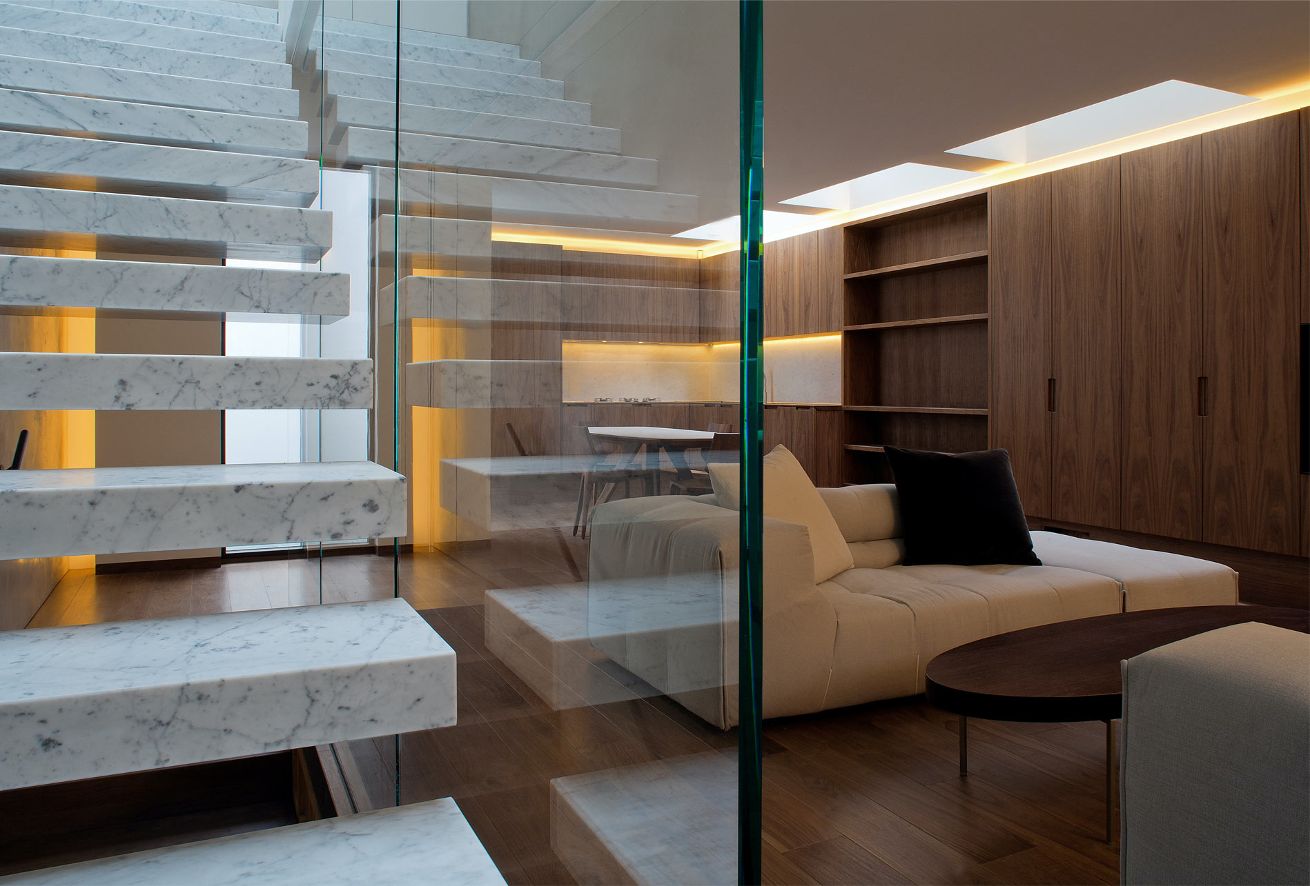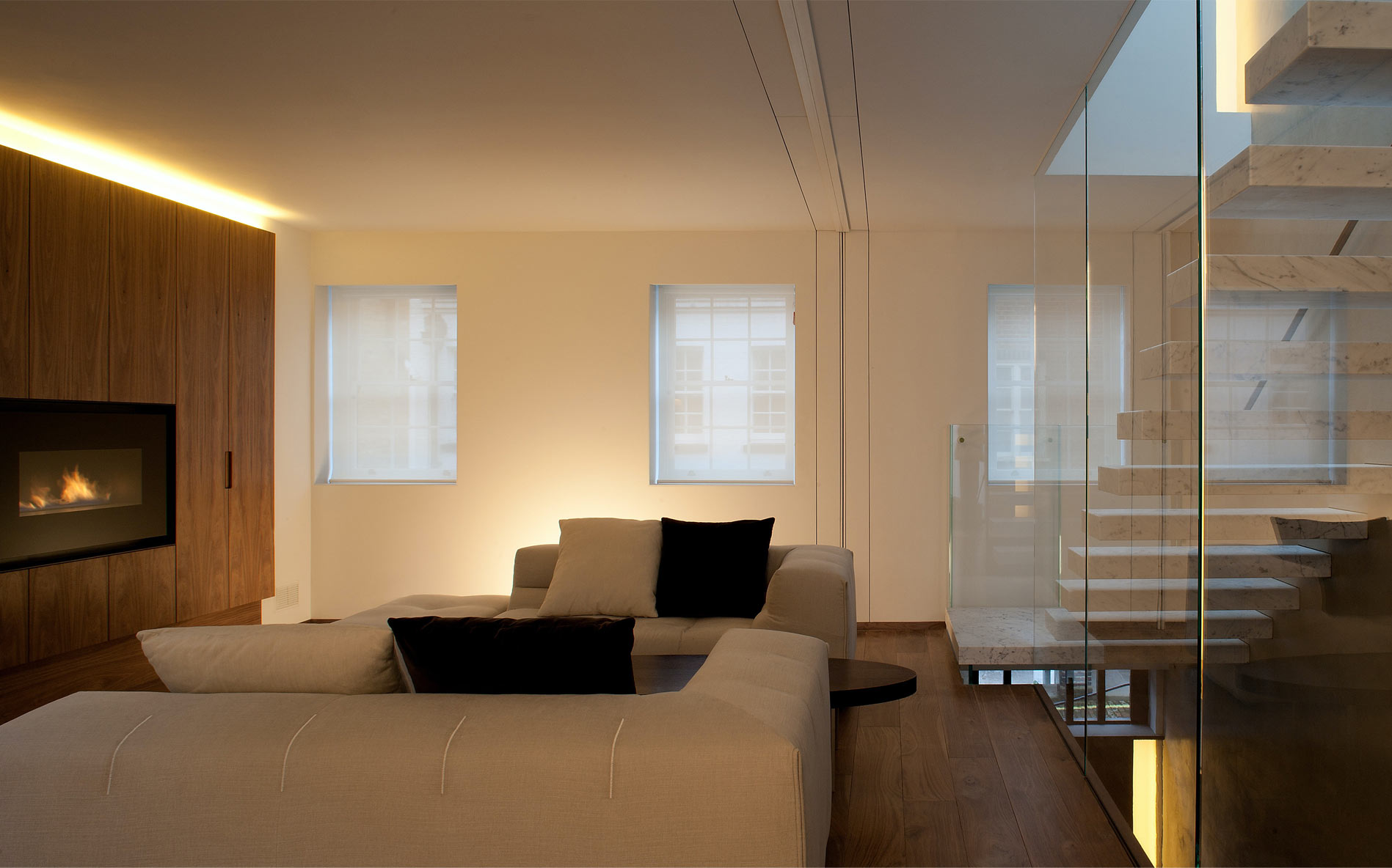 Archer Humphryes retained the character of the stable door mews façade, painting the brick a traditional London railings colour to enhance the picturesque Georgian street. The interior was remodelled within the constraints of the 18th century template. Mews houses generally have a singular aspect and it was important to top-light the property in order to filter light down through the house. A crucial intervention was made to cascade light into a newly created, three storey void. Within this, the architects introduced the scheme’s key feature, a cantilevered marble stair that hovers, without touching, against a glass wall separating the xx from the living space. This achieves the theatrical drama intended in the design, and helps to anchor the individual spaces arranged off it.